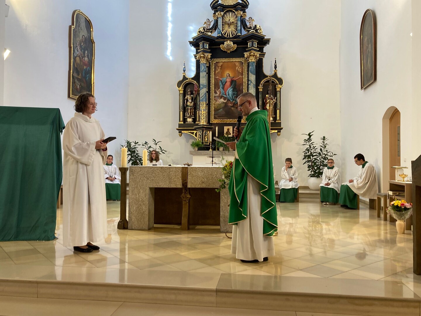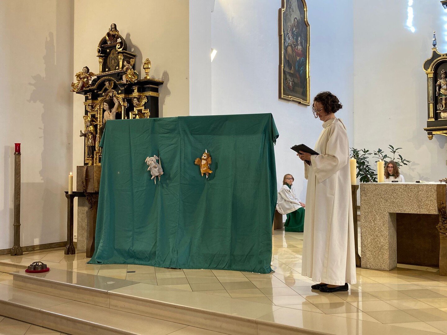 Im Gottesdienst am Sonntag, 7. September in der Pfarrkirche Mariä Himmelfahrt wurde Lea Schaschek feierlich in ihr Amt als Gemeindereferentin in der Pfarreiengemeinschaft eingeführt. Pfarrgemeinderatssprecher Felix Kestl begrüßte sie nach dem Einzug mit einem bunten Blumenstrauß und Pfarrer Alexander Huber erfragte ihre Bereitschaft für den Dienst in den Gemeinden und hieß sie herzlich willkommen. Daneben ließen es sich die beiden Kirchen-Tiere Fips und Schuhu nicht nehmen "die Neue" ein bisschen auszufragen und so auch den Gottesdienstbesuchern die Möglichkeit zu geben, sie etwas besser kennenzulernen.